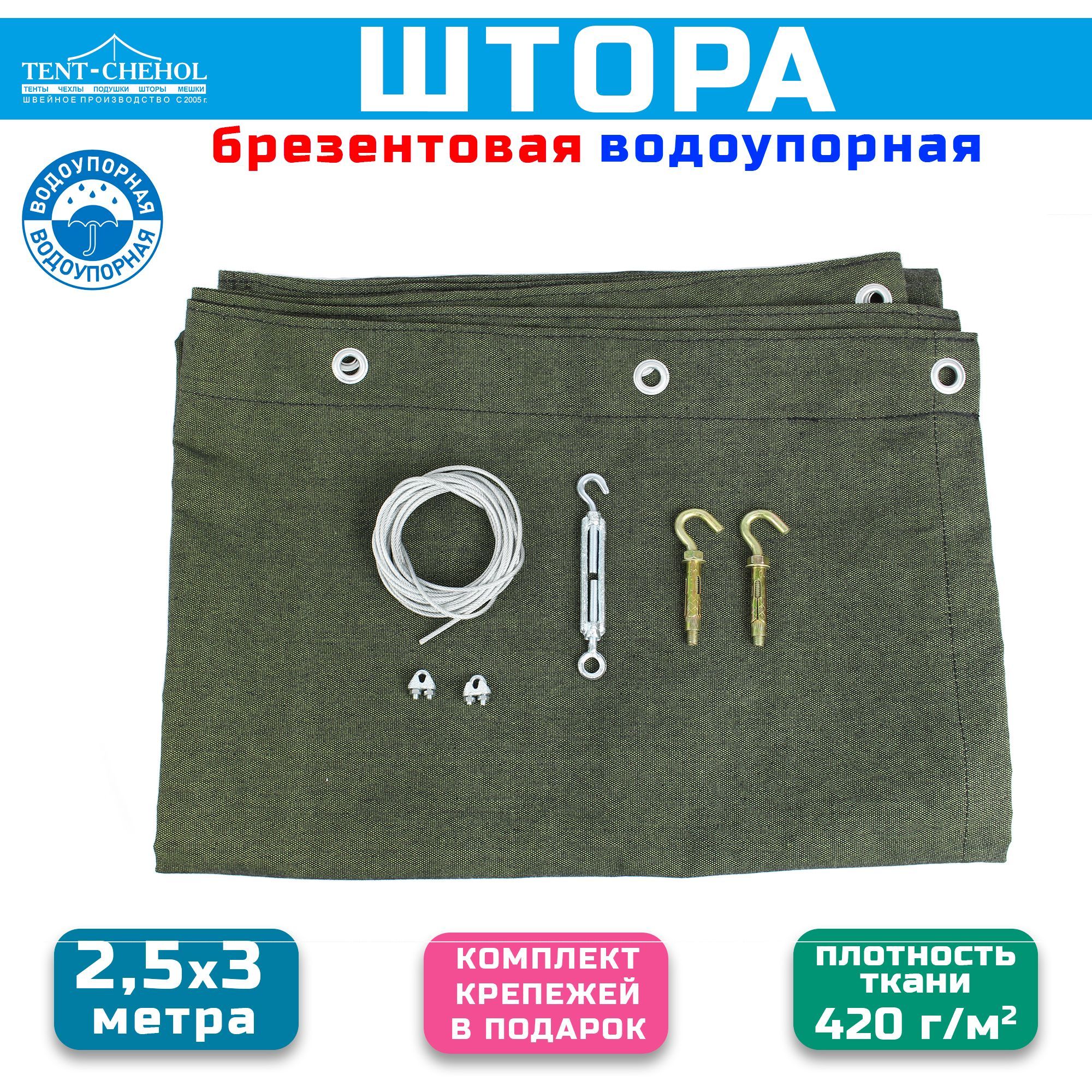 Штора изготовлена из усиленного водоупорного брезента плотностью 420 г/кв.м, соответствует нормам ГОСТ.